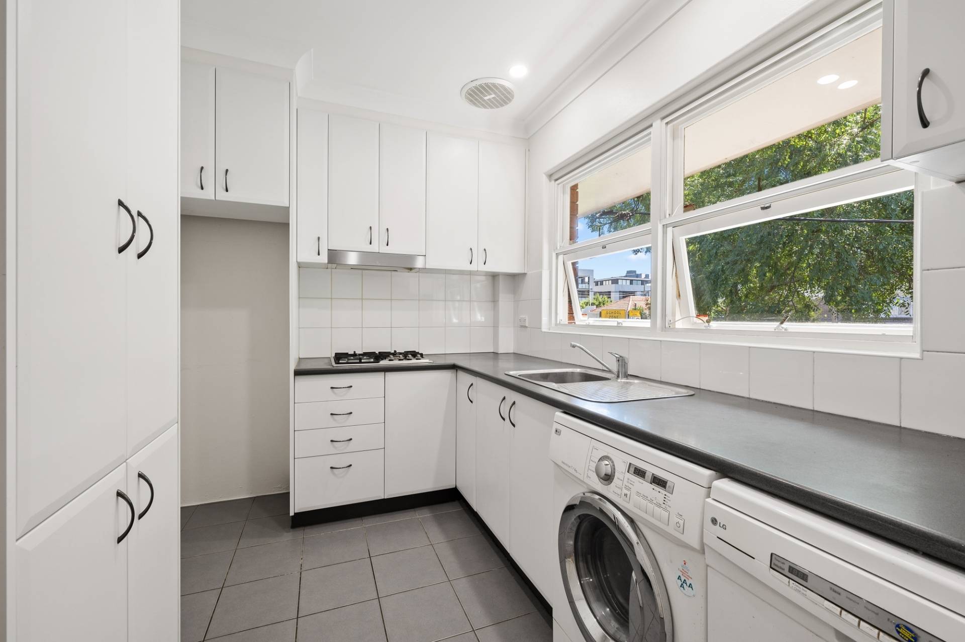 - Kitchen with gas stove, ducted rangehood, ample storage.